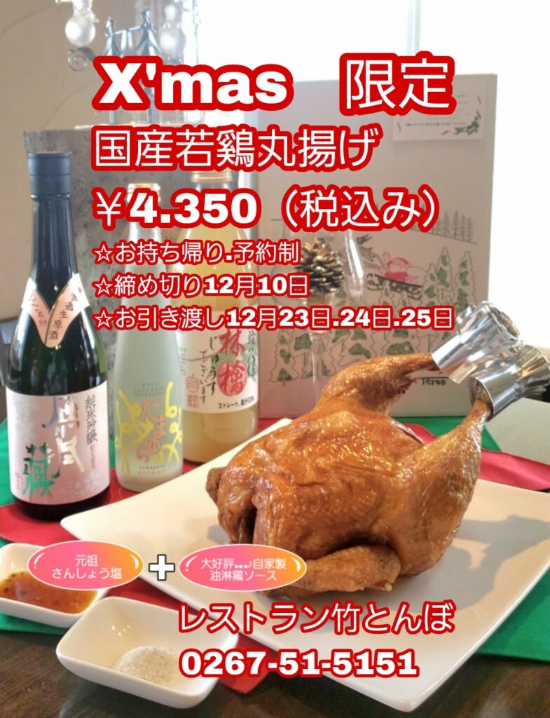 2025クリスマス限定若鶏丸揚げ今年も頑張ります...♪︎12月23日、24日、25日で販売させて頂きます若鶏丸揚げの他にも点心のテイクアウトもご用意しています遠方へのプレゼントは発送のご予約も承っています詳細は画像でご確認お願い致します