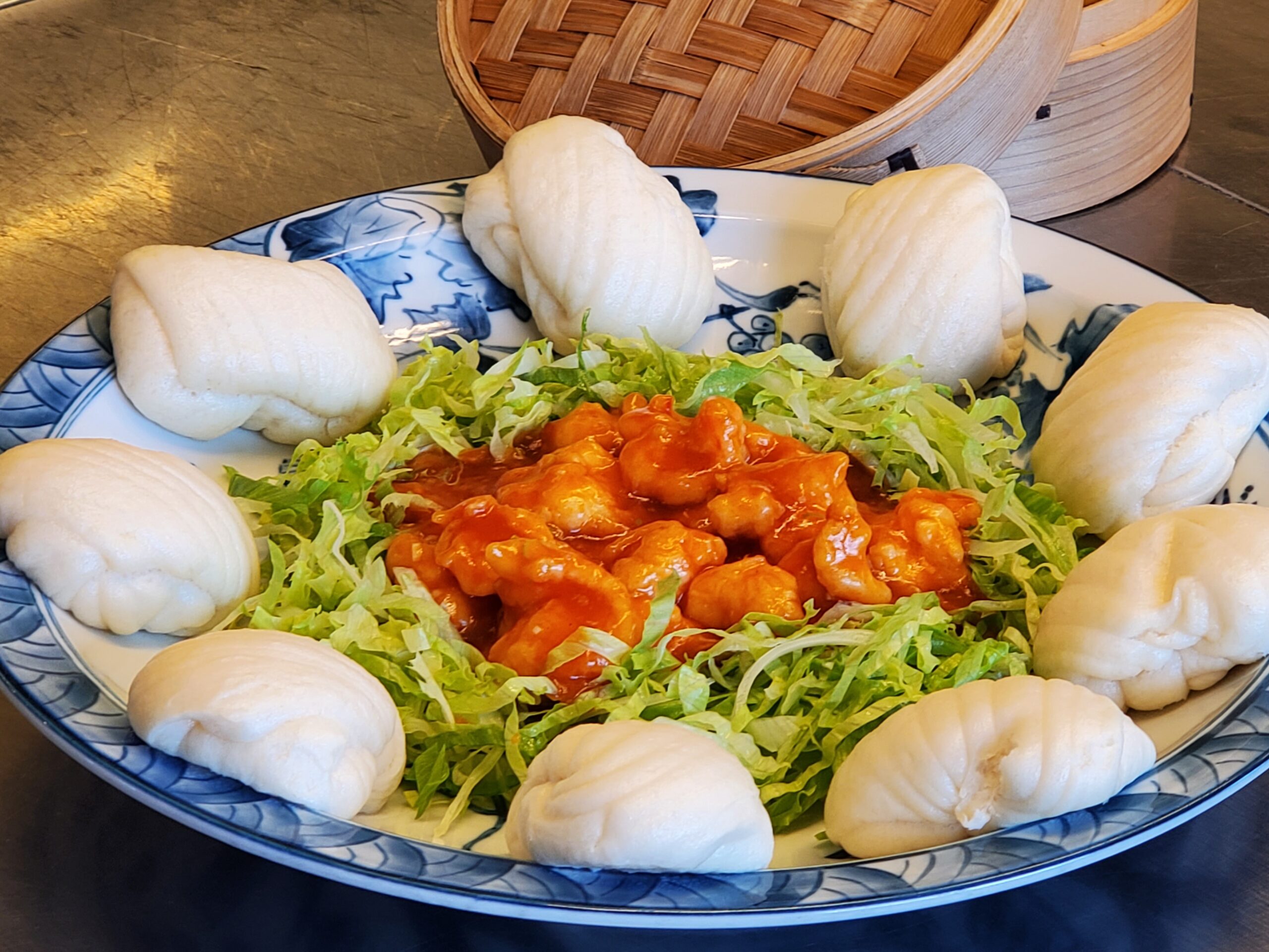 乾焼明蝦片 ブログ 2025.08.27 長和町F.Kさん主催料理教室プチ研修で当店の ランチをご利用いただきました…♪︎ 参加者からの希望料理も含め創作しながら久しぶりの 乾焼明蝦片(大海老の殻をむき背割りにした チリソース)蒸しパン添えでした