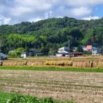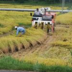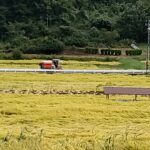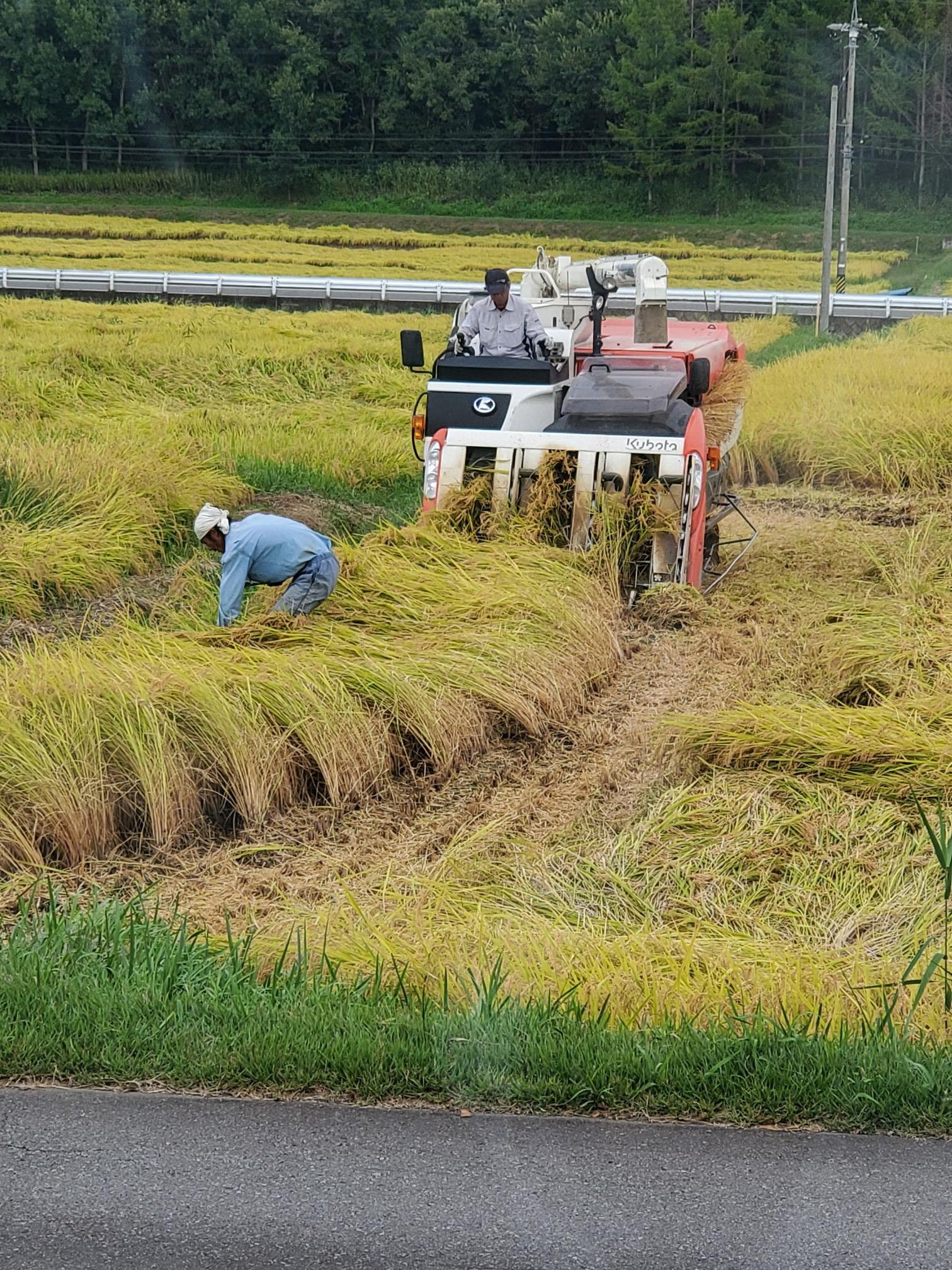 収穫 ブログ 2025.09.22 米騒動も落ち着かないうちに2025の収穫が最盛期 です…♪︎ 周辺田んぼの稲は気候変動で大半が倒れています 大型コンバインの作業は効率良いが、はぜ掛け米の 作業は大変そうです