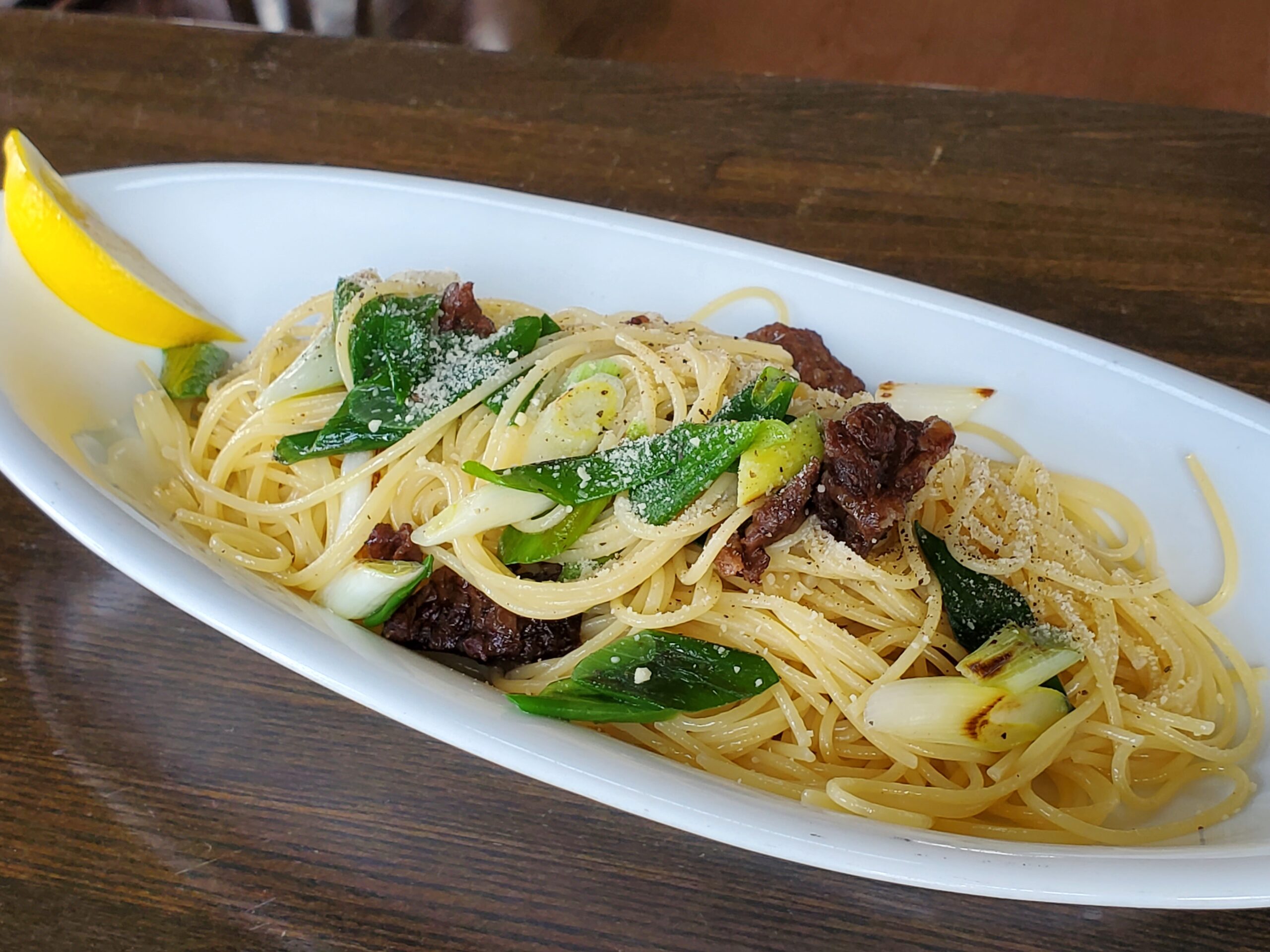 本日のまかない ブログ 2026.03.302026.03.31 松本一本葱の契約栽培を市内の佐藤さん家に毎年 お願いしています、今回は時期外れの保存葱が 入手出来たので早速焼き葱とKOTOKOTO柔らかく 煮込んだ牛スジのパスタをまかないにしました…♪︎ *越冬野菜はほんのり甘く美味しくご馳走さま でした